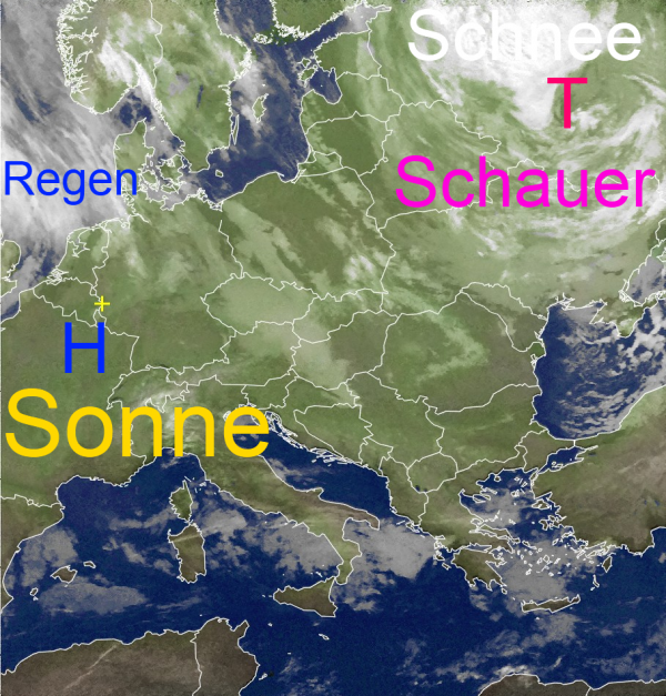 Über Russland befindet sich noch das Sturmtief "HERWART" mit Schnee- Regen- und Schauerwolken.