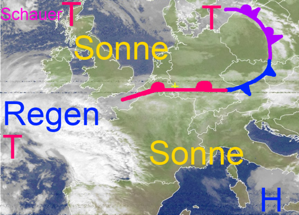 Das Tief westlich von Frankreich pumpt morgen wärmere Luft von Spanien nach Mitteleuropa. Die Temperaturen können dabei gebietsweise auf vorfrühlingshafte Werte von 15 bis 19 Grad klettern. Allerdings ist die Luftmasse auch ziemlich feucht, so dass die Sonne eher selten zum Zuge kommt. Dafür bringen dichtere Wolken immer wieder Regen oder Schauer, vereinzelt kann es auch blitzen und donnern.