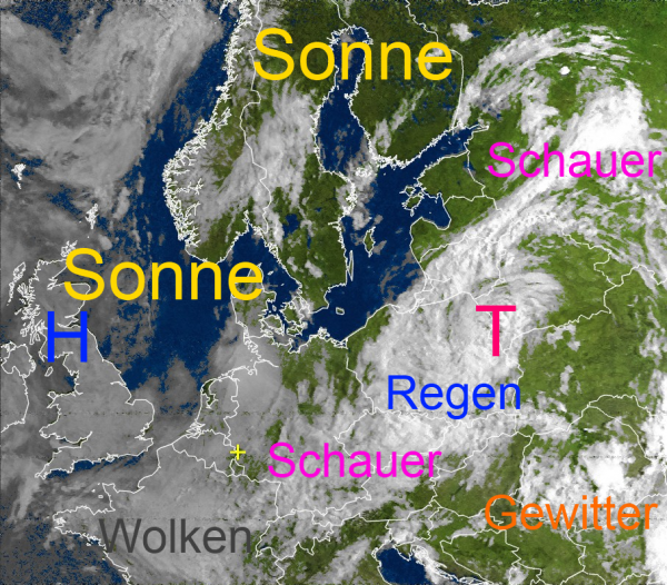 Während über Polen weiterhin ein Tief munter seine Kreise dreht, und weite Teile Europas mit Regenschauern und Gewittern versorgt, strahlt im hohen Norden doch verbreitet die Sonne. Lediglich über Finnland halten sich örtliche Regen- und Schauerwolken.