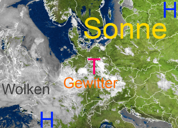 Über Deutschland erkennt man die Gewittercluster, die in der letzten Nacht vor allem dem Süden und Südwesten große Niederschlagsmengen bescherten. Zum Teil fielen über 50 Liter Regenwasser pro Quadratmeter. Am Saarbrücker Flughafen Ensheim fielen 66 Liter pro Quadratmeter, in Dienstweiler (Landkreis Birkenfeld im Hunsrück) fielen 65,5 Liter pro Quadratmeter und in Lenzkirch-Ruhbühl (Baden-Württemberg) waren es 64 Liter pro Quadratmeter.