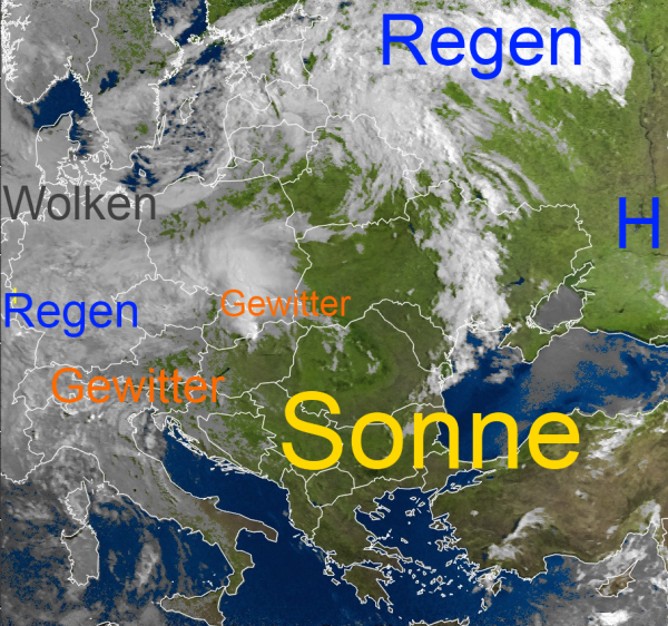 Während über Mitteleuropa verschiedene Luftmassen miteinander kämpfen und gebietsweise Regenfälle und Gewitter auslösen, strahlt über weiten Teilen Südosteuropas die Sonne von einem blauen Himmel. Gewitterzellen sind hier nur vereinzelt zu finden. Die Höchsttemperaturen liegen auf dem Balkan zum Teil über 35 Grad. Schwitzen ist dort also angesagt.