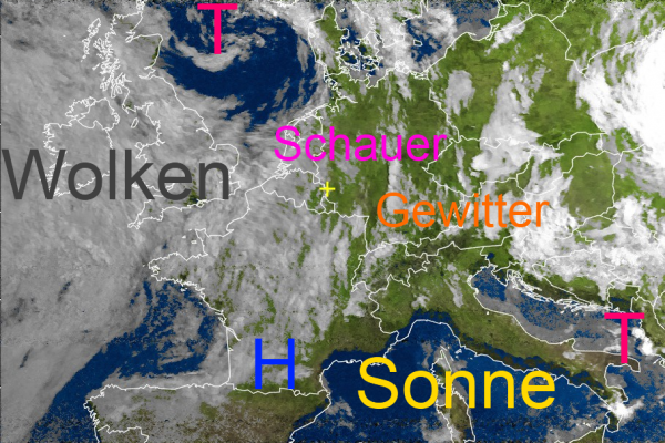 Das Tief über der Nordsee schickt uns mit etwas auffrischenden Westwind Wolken mit örtlichen Schauern und kühlere Luft vom Atlantik. Im Osten und Südosten unseres Landes können sich im Tagesverlauf in der noch warmen und schwülen Luftmasse teils kräftigere Regengüsse und Gewitter entwickeln.