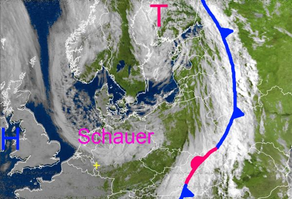 Die hinter der über Osteuropa angelangten Kaltfront eingeflossene kühle Nordmeerluft sorgte über der Nordhälfte unseres Landes, sowie im Bereich der Mittelgebirgen für höhere Labilität. Örtlich traten kräftigere Regengüsse auf, vereinzelt auch in Verbindung mit Blitz und Donner. Auch in den nächsten Stunden kann es noch zu einigen Schauern kommen. Freundlicher war es heute über Teilen Schleswig-Holsteins, dem Ostseeumfeld, sowie im Süden und Südwesten.