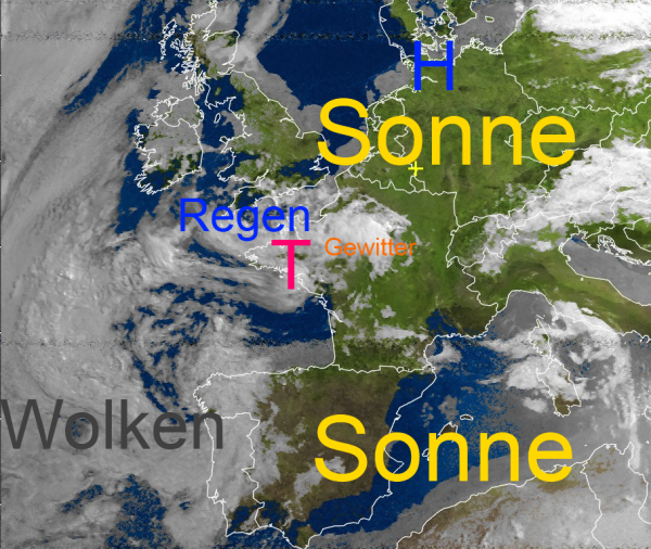 Das Tief über der Bretagne sorgt über West- und Mittelfrankreich für einige Regen- Schauer- und Gewitterwolken. Es verlagert sich langsam nach Osten und gewinnt morgen an Einfluss auf den äußeren Südwesten unseres Landes. Dann steigt auch hier das Gewitterrisiko allmählich an.