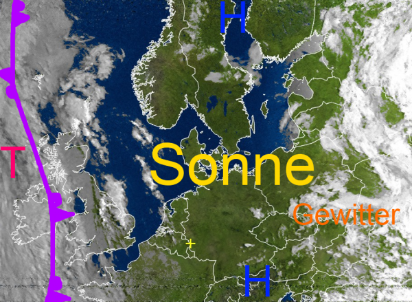 Die Wolken bei den Britischen - Inseln und Irland gehören zu einer Front, die uns morgen von West nach Ost überqueren wird und teilweise kräftige Schauer und Gewitter auslösen kann. Aschließend kühlt die Luft kurzfristig ab.