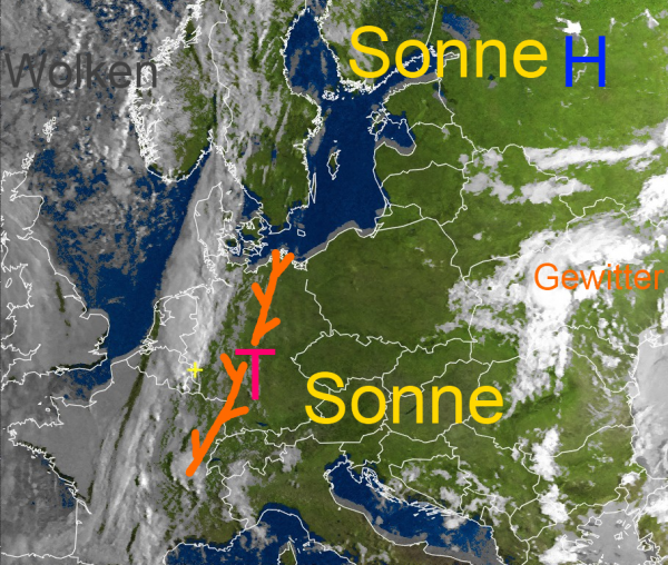 Im Bereich der Konvergenzzone können sich im Tagesverlauf örtliche Regengüsse und Gewitter bilden, die teilweise recht kräftig ausfallen. Dabei werden die sehr warmen bis heißen Temperaturen deutlich nach unten gedrückt. Sonst findet man über dem Europäischen Kontinent auch große Gebiete mit Sonnenschein.