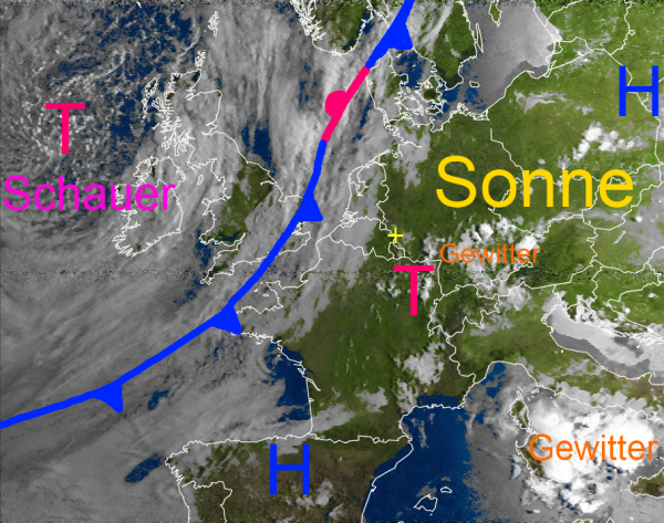 Viele Hitzegeplagte dürfen morgen durchatmen. Die Kaltfront des Tiefs über dem Atlantik und dem Nordmeer überquert uns in der Nacht mit örtlichen Regengüssen und Gewittern. Dahinter gehen die Temperaturen um fast 10 Grad zurück.