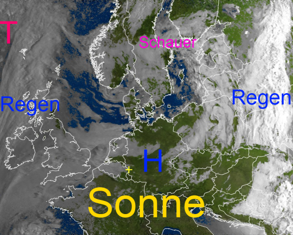 Sowohl über Westeuropa, als auch über dem Osten unseres Kontinents findet man ausgedehntere Wolken von Störungen, aus denen es gebietsweise regnet oder Schauer auftreten.