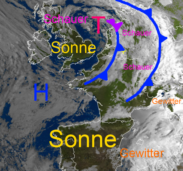 Meist freundliches Wetter mit reichlich Sonnenschein gibt es weiterhin über Spanien, auch über England hat sich ein sonniges Fenster aufgetan.