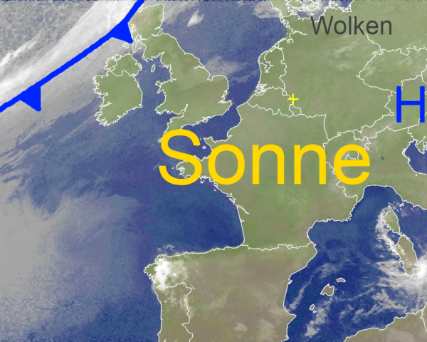 In weiten Teilen unseres Kontinentes strahlt die Sonne von einem blauen Himmel und treibt die Temperaturen vielerorts nochmals in den spätsommerlichen Bereich. Nur stellenweise sind einige Wolkenfelder zu finden. Die Kaltfront im Nordwesten nähert sich abends dem äußersten Norden unseres Landes. Sie wird morgen Deutschland von Nord nach Süd mit dichteren Wolkenfeldern überqueren und lokal auch etwas Regen bringen. Hinter der Front gehen die Temperaturen dann wieder zurück.