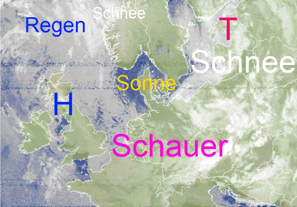 Zwischen dem Tief über dem Baltikum und dem Hoch bei Schottland strömt recht kalte Luft nach Mitteleuropa. Die Schauer, die teils als Regen, teils als Schnee fallen ziehen sich jedoch immer weiter in den Süden und Osten unseres Landes zurück. Von Norden lässt sich teilweise auch mal die Sonne blicken.