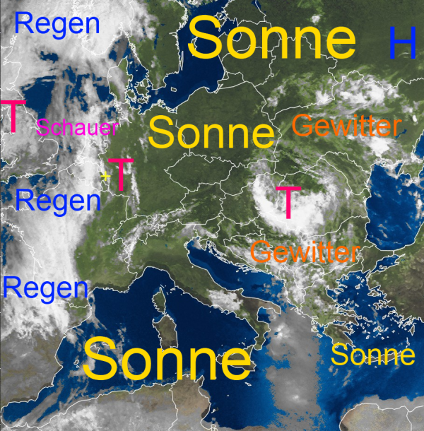 In der feucht-warmen Luftmasse bilden sich zum Teil mächtige Schauer- und Gewittercluster, wie z.B. über dem Balkan und nordwestlich des Schwarzen Meeres.