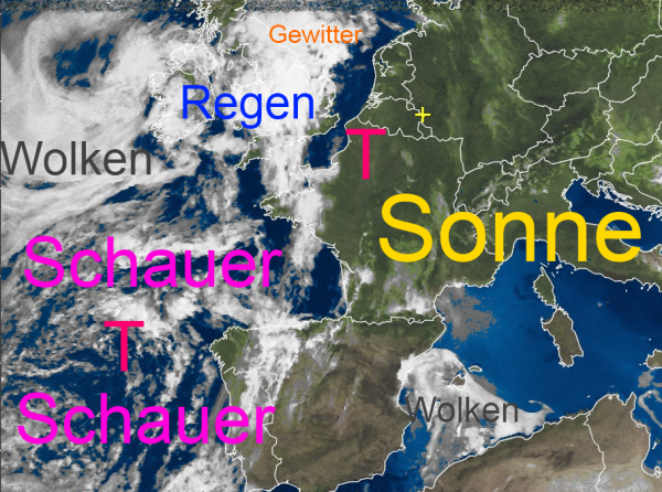 Anders sieht es dagegen über den Britischen Inseln, Irland und dem Atlantik aus. Hier halten sich oft kompaktere Wolken mit Regen oder Schauern. Über der Nordsee haben sich auch einige Gewitter bilden können. Dazwischen findet man aber auch kleinere Aufheiterungszonen.