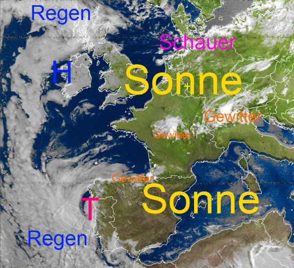 Über weiten Teilen des Europäischen Kontinentes erkennt man größere wolkenfreie Gebiete mit reichlich Sonnenschein, aber auch einige Gewittercluster, hauptsächlich im Bereich der Alpen, über Zentralfrankreich, sowie über dem Baskenland. Von der Nordsee ziehen einige wabenförmige Wolkenfelder mit schlappen Schauern über den Norden unseres Landes hinweg.