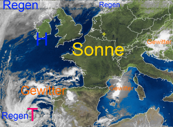 Vor Portugal hat sich ein Wolkenwirbel mit Regen, Schauern und Gewittern gebildet. Auf der Vorderseite des Tiefs gelangt am Freitag und Samstag wieder sehr warme bis heiße und teilweise auch schwüle Luft in die Südhälfte von Deutschland.
