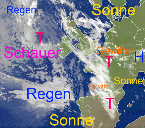 Erste Gewittercluster sind am Morgen bereits schon über Nordfrankreich entstanden. Diese werden von der heißen Sonne am Tage wieder aufgelöst. Gegen Abend entsteht im Südwesten unseres Landes jedoch ein kleines Tief. Bei gleichzeitig zunehmender Schwüle brauen sich infolge dessen teils kräftige Gewitterwolken zusammen, wobei auch Platzregen und Hagelschlag drohen. Diese bringen am Wochenende wohltuende Abkühlung.