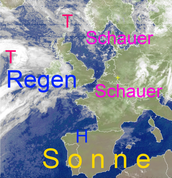 Zwischen kompakteren Wolken mit Regen oder Schauern erkennt man über Teilen des Kontinentes aber auch sonnige Flecken.