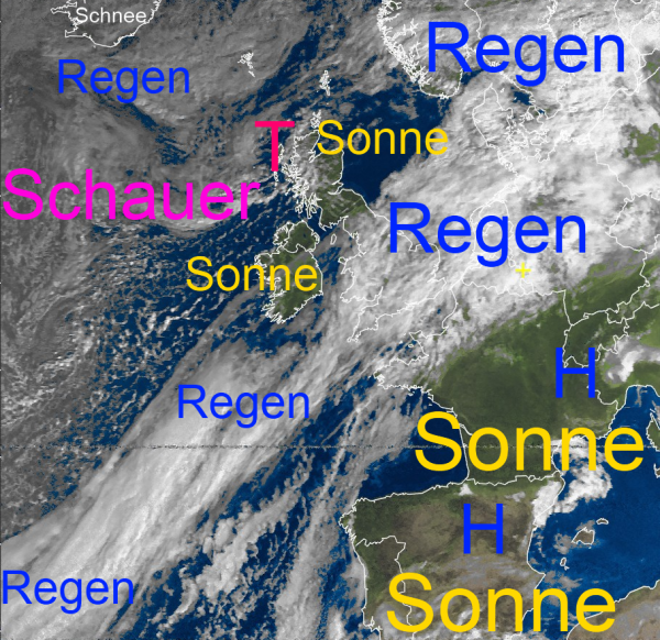 Auf dem Satellitenbild erkennt man das langgestreckte Wolken- und Regenband des Tiefs bei Schottland, welches vom Atlantik, über England bis zur Ostsee verläuft. Auch der Nordwesten und Norden unseres Landes werden davon noch erfasst.