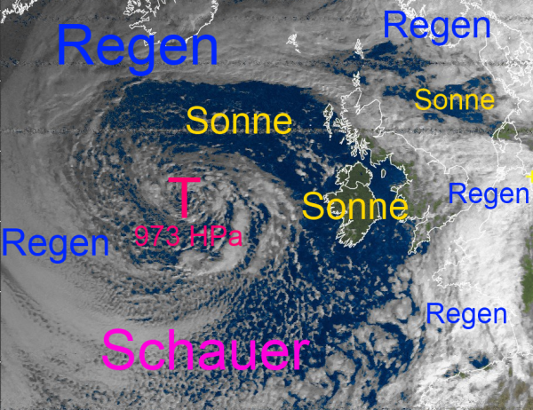 Über dem Atlantik hat sich ein klassischer Wolkenwirbel gebildet. Er gehört zu einem umfangreichen Sturmtief mit einem Kerndruck von 973 HPa. Mit südwestlichen Winden driften dabei in den nächsten Tagen Regen- und Schauerstaffeln im Wechsel mit kurzen sonnigen Phasen nach Mitteleuropa, die das Wetter auch in unserem Land sehr durchwachsen aber insgesamt recht mild gestalten werden. Am Wochenende wird sich das Tief dann unter allmählicher Abschwächung über den Britischen Inseln einnisten.
