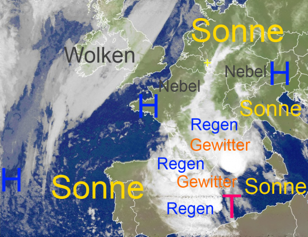 Wesentlich ruhiger gestaltet sich das Wetter über Mitteleuropa. Hier hat sich eine Hochdruckzone gebildet, die für ruhiges Herbstwetter verantwortlich ist, wobei es zu einer Mischung aus morgendlichen Nebelfeldern, einigen dichteren Wolkenfeldern, aber auch "goldener Oktobersonne" kommt. Dazu wird es allgemein sehr mild.