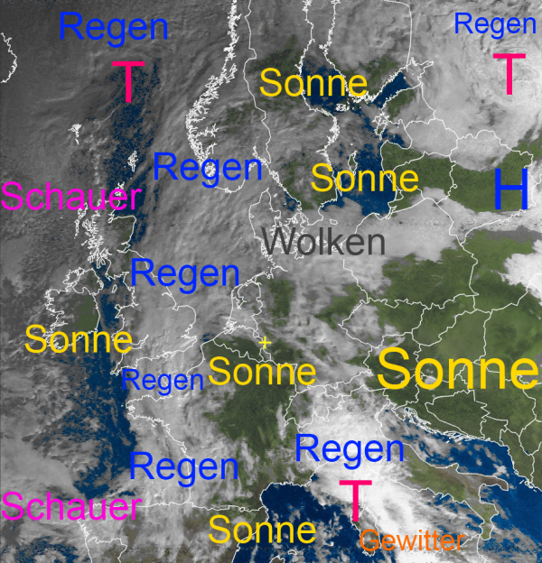 Die Regenzone des Tiefs über dem Nordmeer reicht von Norwegen, über die Nordsee, die Britischen Inseln und Westfrankreich bis nach Spanien. Sie wird sich bei ihrer allmählichen Ostwärtsverlagerung deutlich abschwächen und uns somit vorerst von Regen verschonen.