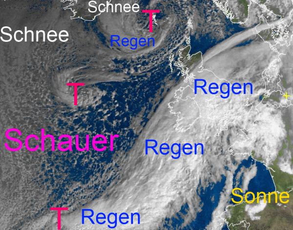 Hier erkennt man zwei schöne Wolkenwirbel, ein steuerndes Zentraltief im Seegebiet zwischen Island und Schottland, ein Randtief weiter draußen auf dem Ozean und ein Tief im Bereich der Azoren. Während sich das Randtief über dem Ozean auffüllt, wandern die anderen beiden Tiefs bis zum Sonntag Richtung Skandinavien, wobei das Tief bei den Azoren wesentlich flinker ist und schon am Sonntagabend voraussichtlich Nordwestrussland erreicht. Das dazugehörige Wolkenband, welches momentan vom Atlantik, über die Britischen Inseln, bis zur Nordsee verläuft kommt allmählich Richtung Mitteleuropa voran und wird von Samstag auf Sonntag den Westen und Nordwesten unseres Landes mit seinem Regengebiet erfassen. Gleichzeitig entwickelt sich weiter draußen über dem Meer ein Hochdruckgebiet. Zwischen diesem Hoch und den beiden Tiefs über Skandinavien und Nordwesrussland wird dann der Weg frei für polare Kaltluft, welche Mitteleuropa hinter der angesprochenenen Störungszone mit Wolken und Regen erreichen wird. Infolgedessen müssen wir uns nun von dem bisherigen außerordentlich milden Oktoberwetter verabschieden. In der neuen Woche breitet sich voraussichtlich die polare Kaltluf über Mitteleuropa aus, welche die Temperaturen oft in den einstelligen Bereich drückt. Dadurch sinkt in den Alpen die Schneefallgrenze deutlich ab. In den Nächten stellt sich bei längerem Aufklaren häufiger Frost ein.
