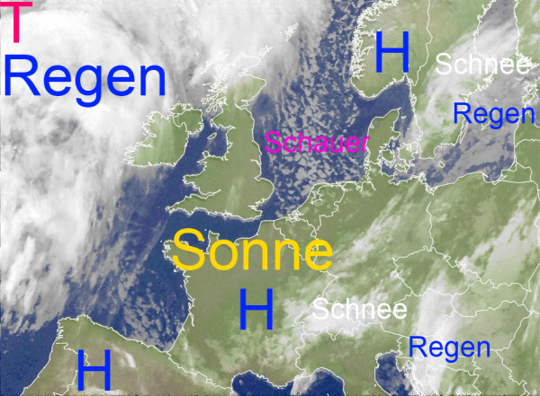 Die Hochdruckzone die von Spanien über Frankreich bis nach Norwegen verläuft sorgt heute in großen Teilen Mitteleuropas für eine kurze Wetterberuhigung, bevor morgen wieder die kompakten Wolken über dem Atlantik mit Regen im Flachland und Schnee in den Bergen nach Deutschland voran kommen werden.