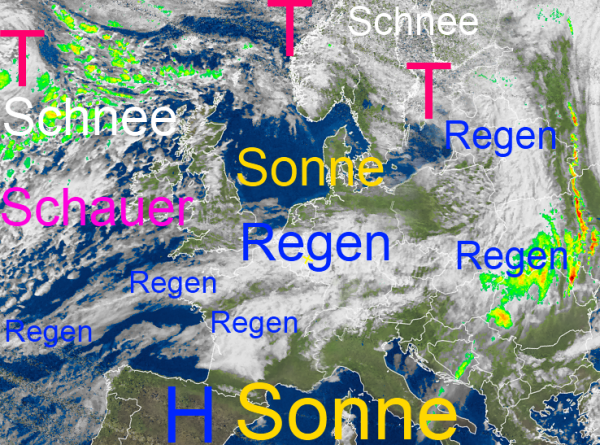 Aus der kompakten Wolkenschiene, die vom östlichen Atlantik, über Mittel- und Osteuropa, bis zum Baltikum verläuft fällt zum Teil kräftiger Regen. Diese Wolkenzone kennzeichnet eine Luftmassengrenze, welche sehr milde Frühlingsluft im Süden von kälterer Luft im Norden trennt.
