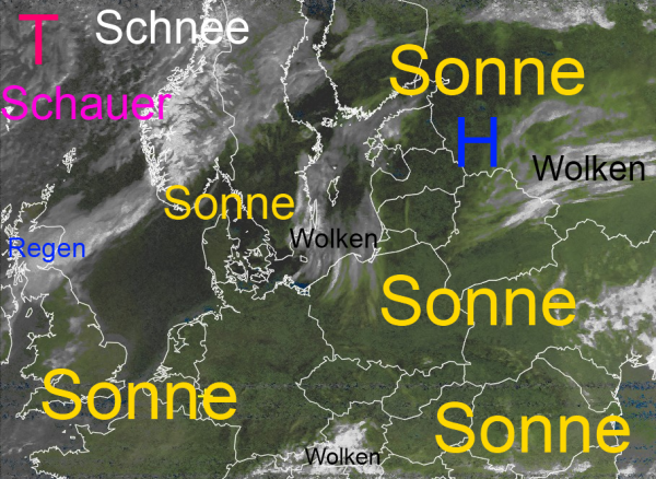 Niederschlag fällt jedoch im Bereich des Tiefs über dem Nordmeer, teilweise in Schauerform und weiter im Norden, sowie im Bereich des Skandinavischen Gebirges meist in Form von Schnee.
