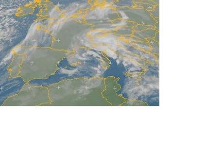 Auf dem Satellitenbild von Freitag früh ist im westlichen Mittelmeer ein Tief gut zu erkennen. Seine Ausläufer bringen Wolken und Regen bis an die Adria und nach Österreich. Vor allem von den Balearen bis Italien sind teils kräftige Gewitter mit teils stürmischen Böen möglich. (Bildquelle: EUMESAT)