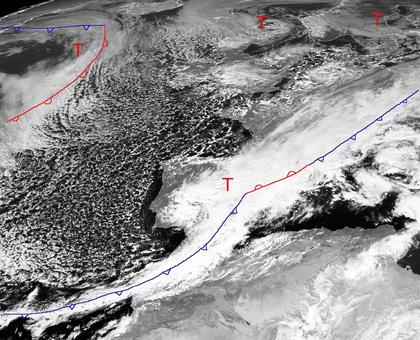 Eine langgestrecktes Wolkenband eines Frontensystems liegt auch heute quer über Europa und trennt warmer Luft im Südosten von kalter im Nordwesten. Über dem Atlantik zeigen sich bei Island die Wolken eines weiteren Tiefs. Dazwischen befindet sich über dem Atlantik eine größere Zone mit Schauerwolken. Das Frontensystem bleibt bis morgen fast stationär, sodass sich an der Großwetterlage nicht viel ändert. (Bildquelle: Copyrigt EUMETSAT, NERC Satellite Receiving Station, University of Dundee)
