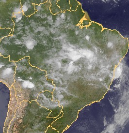 Das heutige Satellitenfoto zeigt über Zentralbrasilien zum Teil hochreichende Quellbewölkung, die dort gebietsweise für kräftige Schauer und Gewitter sorgt.
