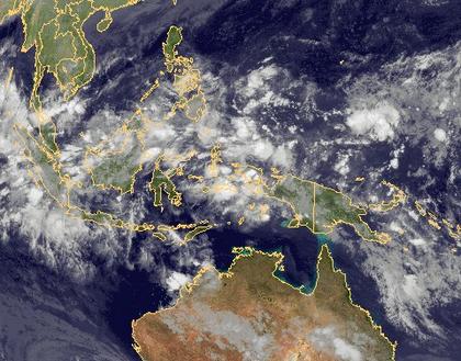 Auf dem Satellitenbild ist über Indonesien die innertropische Konvergenzzone an den Wolken erkennbar. In ihrem Bereich treten schwere Schauer und Gewitter auf.