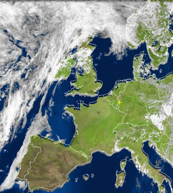 Auf dem Satellitenfoto von heute Nachmittag präsentiert sich der europäische Kontinent zum weitaus größten Teil sonnig und dazu trocken. Ein Tief westlich der Britischen Inseln bringt jedoch besonders dem Norden Schottlands sowie dem nordwestlichen Irland oft dichte Wolken und unbeständiges Wetter mit Schauer, teils auch mit längerandauerndem Regen.