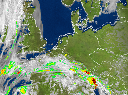 Schön sind die Wolken im Satbild zu sehen, über Frankreich.