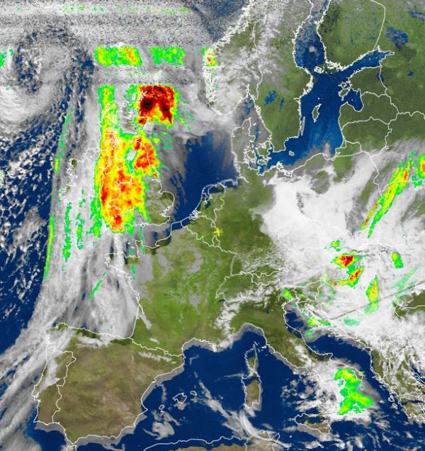 Auf dem Satellitenbild von heute Nachmittag ist gut das Zentrum des Sturmtiefs "Friedhelm" nordwestlich der Britischen Inseln auszumachen. Seine Ausläufer bringen über den Britischen Inseln verbreitet sehr regnerisches und windiges Wetter. Vielerorts fällt kräftiger und ergiebiger Regen, dabei wird erwartet, dass besonders kleinere Bach- und Flussläufe über ihre Ufer treten.