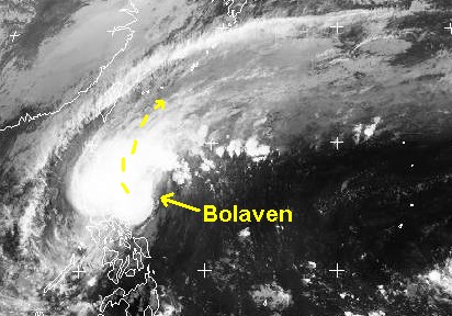 Der Taifun 'Bolaven' östlich von den Philippinen hat sich etwas abgeschwächt, seine Windgeschwindigkeit beträgt zur Zeit 110, in Böen bis 140 km/h, heute und morgen überquert er die philippinische Insel Luzon von Südost nach Nord und zieht dann weiter nach Norden, dabei löst er sich voraussichtlich auf.