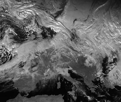 Auf dem Satellitenbild ist nördlich von Schottland das Tief 'Gerhard' mit der typischen Spiralstruktur erkennbar. Vom Atlantik her nähert sich das Tief 'Hans' schnell Mitteleuropa und bestimmt morgen unser Wetter.