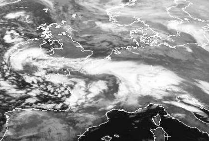 Tief 'Reineke' liegt mit seinem Zentrum zurzeit über dem Ärmelkanal, wo es sich weiter abschwächt. Ein zugehöriges Wolkenband erstreckt sich von Südengland bis zu den Alpen. Es zieht heute mit seinem Regen über Deutschland nach Norden. Südlich des Tiefs erkennt man über Frankreich die lockere Bewölkung einzelner Gewitter, die von der Biskaya ostwärts ziehen.