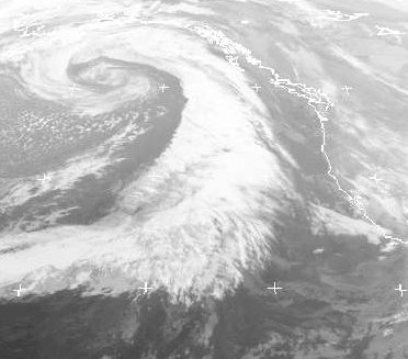 Ein Tiefdruckwirbel liegt über dem Nordpazifik. Das Wolkenband seiner Ausläufer reicht weit nach Süden und zieht langsam nach Osten. Am Donnerstag wird es mit Regen die Westküste des amerikanischen Kontinents erreichen.