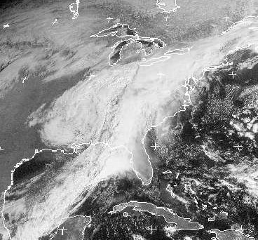 Über dem Osten der USA erkennt man die dichten Wolken eines kräftigen Tiefs. Es trennt feucht-warme Luft im Osten von trocken-kalter im Westen, wo auch kaum Wolken liegen. Im Bereich des Tiefs selbst kommt es zu teils kräftigen Regenfällen oder auch starken Gewittern. Das Tief zieht nach Nordosten. Am Mittwoch bringt es auch dem Osten Kanadas teils kräftigen Schneefall. (Bildquelle: NERC Satellite Receiving Station, Dundee University, Scotland, http://www.sat.dundee.ac.uk/)