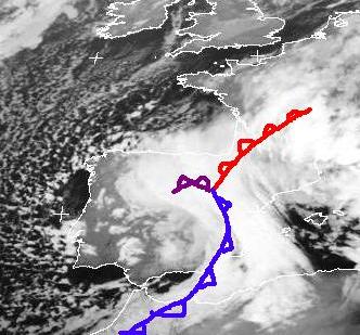 Auf dem Satellitenbild von Sonntag früh ist ein Tief über Spanien gut zu erkennen. Seine Fronten reichen von Westfrankreich bis nach Marokko. Schön zu erkennen sind die einzelnen Schauerzellen, die sich auf der Rückseite der Kaltfront über dem Atlantik gebildet haben. Das Tief wird heute teils kräftige Niederschläge in Nordspanien und Südwestfrankreich bringen.