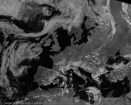 Das heutige Satellitenfoto zeigt Quellbewölkung besonders vom westlichen bis in den zentralen Mittelmeerraum, sowie von der Ägäis bis zum Schwarzen Meer, hierbei entwickeln sich gebietsweise kräftige Schauer und Gewitter. Dichte Wolken bringt ebenfalls ein Nordmeertief in weiten Teilen Nord- und Mittelskandinaviens. Hochdruckeinfluss herrscht dagegen in einem breiten Streifen von Nordwest- und Westeuropas bis zum Uralgebirge im Osten Europas.