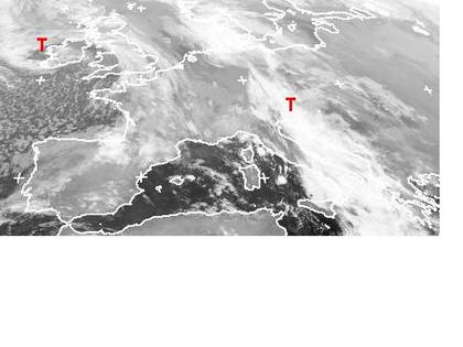Auf dem Satellitenbild von Freitag früh sorgt Tiefdruckeinfluss über West- und Mitteleuropa für meist dichte Wolken mit nur wenigen Auflockerungen. Vor allem über Italien und dem Balkan kommt es dabei zu teils kräftigen Schauern und Gewittern. Weiter nach Osten sorgt Hochdruckeinfluss für meist ruhiges, teils aber auch trübes Wetter. (Bildquelle: NERC Satellite Receiving Station, Dundee University, Scotland, http://www.sat.dundee.ac.uk/)