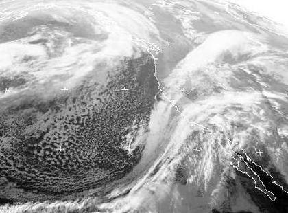 An der Küste von Kalifornien liegt ein Tief mit seinen Regenwolken. Auf seiner Westseite fließt Kaltluft weit nach Süden. Dort erkennt man Schauerbewölkung über dem Pazifik. Weiter nördlich vor der Küste von British Columbia stauen sich die Regenwolken eines weiteren Tiefs.