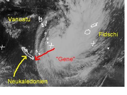 Im Südpazifik befindet sich der Tropensturm 'Gene' derzeit über den südlichen Inseln der Vanuatu. Zurzeit erreicht er mittlere Windgeschwindigkeiten von 148, in Böen 185 km/h. Berechnungen zufolge soll er sich nicht weiter verstärken und Richtung Südwesten auf Neukaledonien zuziehen. Sein Endziel ist noch unklar. (Bildquelle: NERC Satellite Receiving Station, Dundee University, Scotland, http://www.sat.dundee.ac.uk/)