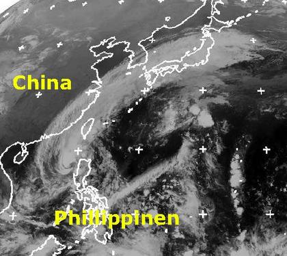 Der Tropensturm 'Peipah' liegt am Montag Mittag im Südchinesischen Meer. Seine Wolkenfelder erstrecken sich dabei bis nach Japan. Die mittleren Windgeschwindigkeiten betragen 100 km/h, in Böen werden 130 km/h erreicht. Er zieht nun voraussichtlich nach Südwesten in Richtung Vietnam weiter, wird sich aber kaum noch verstärken, trotzdem kommt es in seinem Einflussbereich aber zu teils heftigen Regenfälllen. (Bildquelle: NERC Satellite Receiving Station, Dundee University, Scotland, http://www.sat.dundee.ac.uk/)