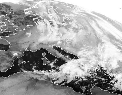Wenn man genau hinsieht erkennt man auf diesem Bild gut die kalte Luft über Osteuropa und dem Mittelmeerraum. In einem Bogen schwingt sich die Grenze zu milderen Luftmassen um das Kaltluftpaket herum. Im Osten liegt die Luftmassengrenze über Russland und dem Schwarzen Meer. Im Norden Griechenlands und der Türkei kann es sogar örtlich schneien. Weiter westlich zieht sich die Front über Süditalien und Nordafrika bis zu den Balearen. Unter Hochdruckeinfluss ist sie hier jedoch äußerst schwach geworden. Im weiteren Verlauf reicht die Luftmassengrenze über Frankreich und Deutschland zurück bis nach Skandinavien, wo sie wieder deutlicher sichtbar ist.