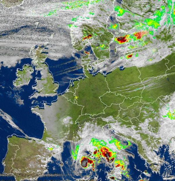 Das Satellitenfoto von heute Nachmittag zeigt ein kräftiges Gewittertief über dem zentralen Mittelmeer. Es sorgt mit seinen Ausläufern dort und vor allem auch entlang der italienischen Mittelmeerküsten für teils schwere Unwetter mit starkem und ergiebigen Regenfällen, Hagel und möglichen Sturmböen.