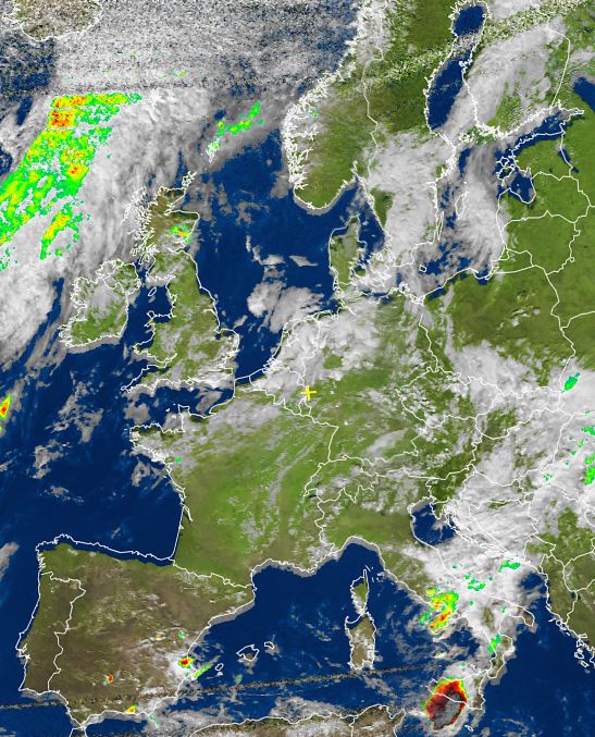 Das Satellitenfoto von heute Nachmittag zeigt uns dichte Wolken über dem südlichen Osteuropa, die hier für zahlreiche Schauer und vereinzelte Gewitter sorgten. Nordwestlich von Großbritannien befindet sich ein Sturmtief, dessen Ausläufer erreichten bereits die Nordwesthälfte von Irland und die Westküste Schottlands. Besonders starke Unwetter sind über Sizilien zu erkennen, hier sorgt subtropische Luft aus der Sahara in Verbindung mit einem Tief bei Italien für ein sehr hohes Gewitterpotenzial.